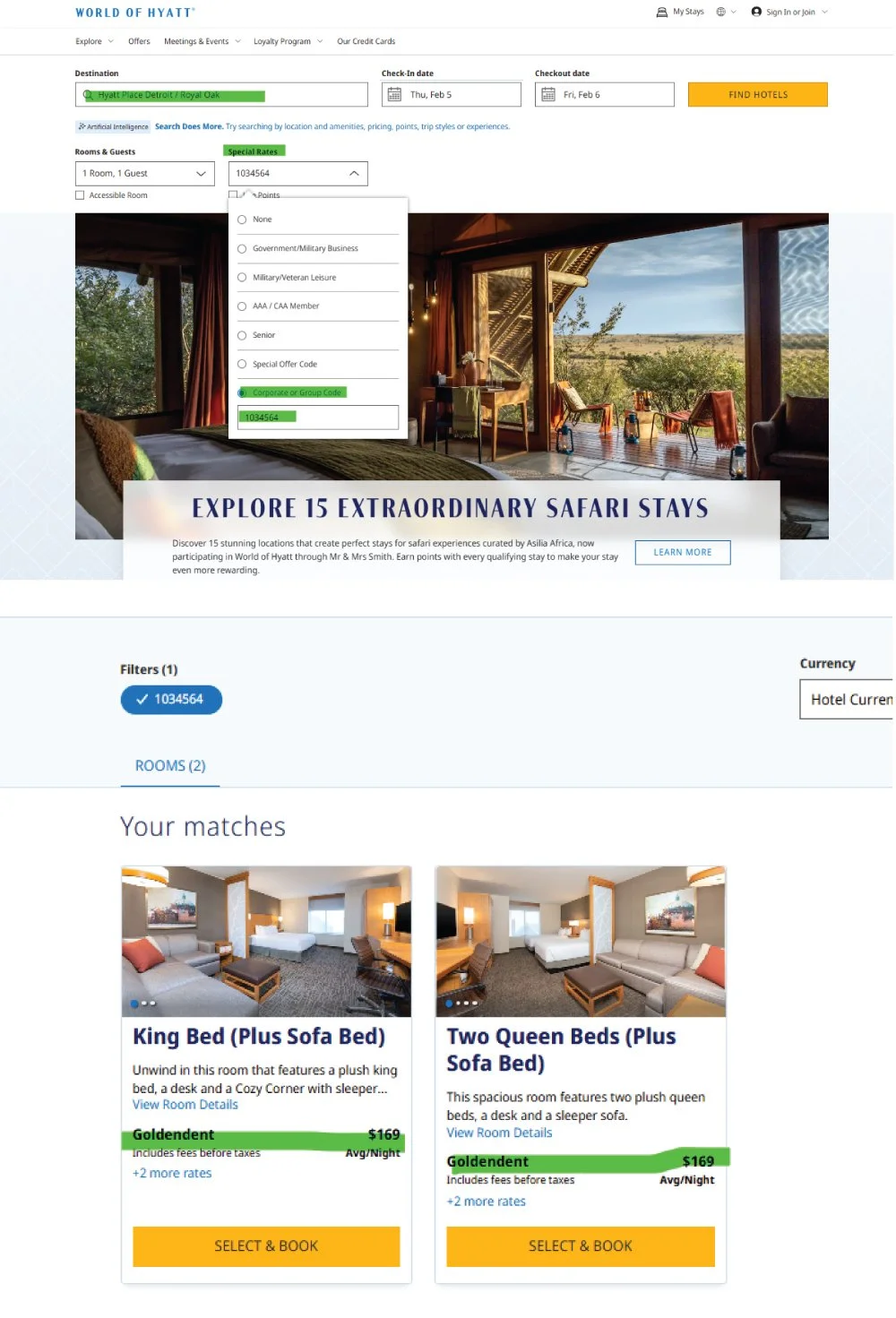 Under “Special Rates” insert 1034564 and click “Find Hotels.” The GoldenDent rate will show you the options available. Don’t wait to book. If no rooms show up under this rate, that means the hotel is at 80% occupancy and corporate rates will be unavailable. See images below for further reference.